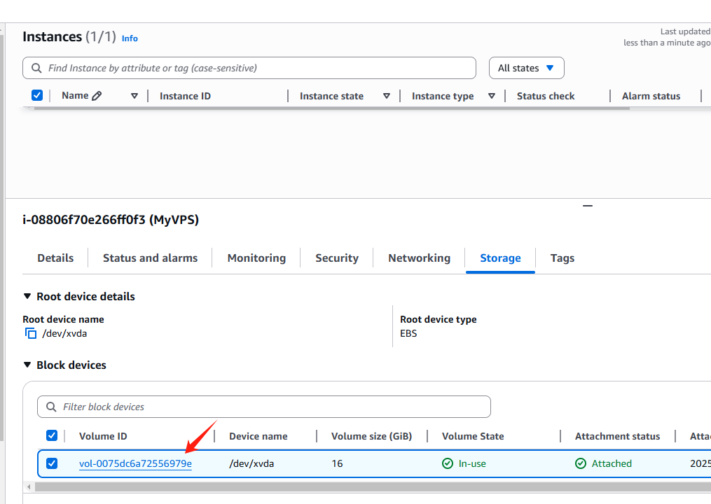 | Quay lại Instance chọn Storage nhấp vào id volume |